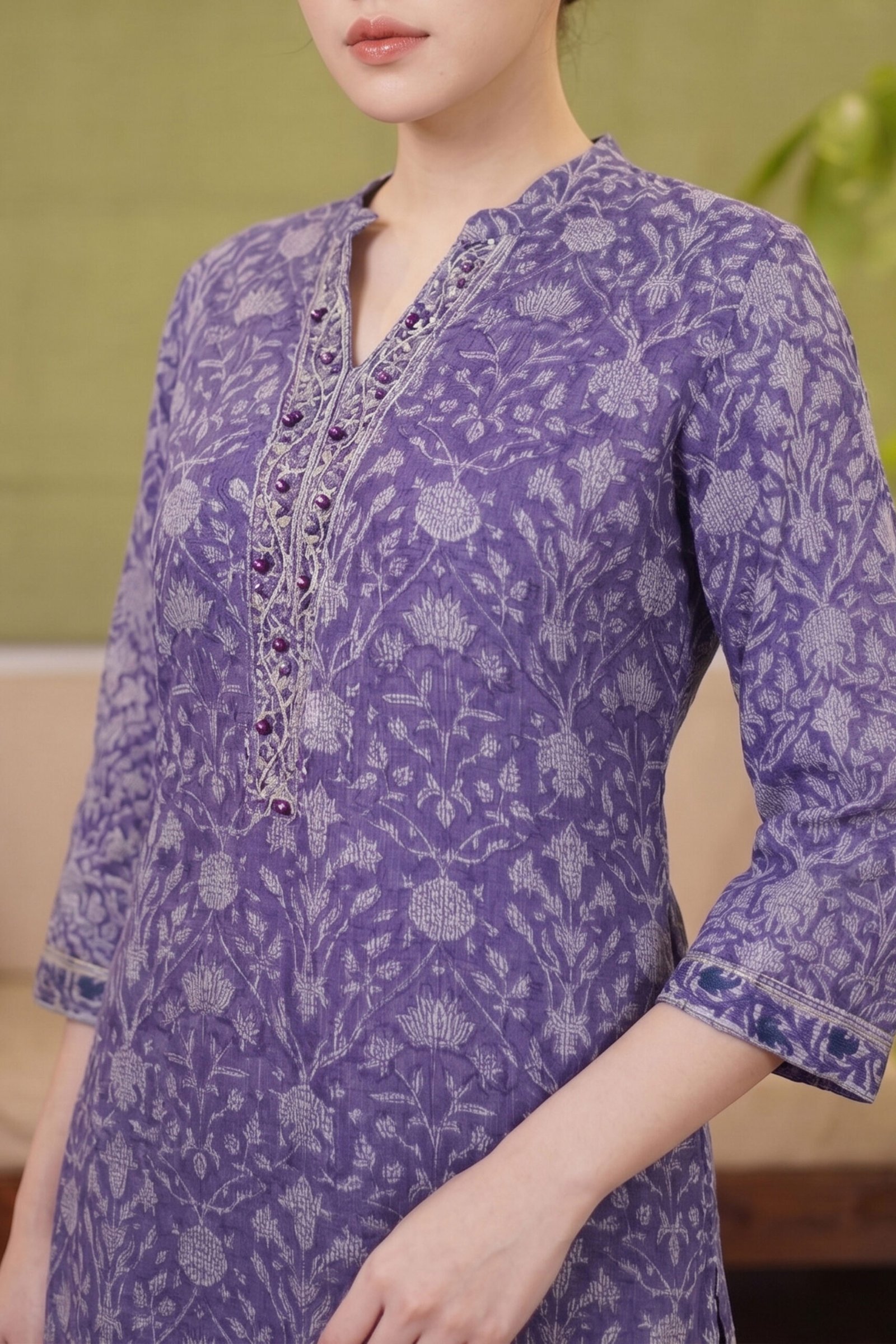 Embrace a serene aesthetic with our Indigo Petal Set, a beautifully curated three-piece ensemble that balances traditional motifs with contemporary styling. This set is crafted from a premium cotton-blend fabric with a subtle slub texture, offering both breathability and a sophisticated drape for all-day wear.