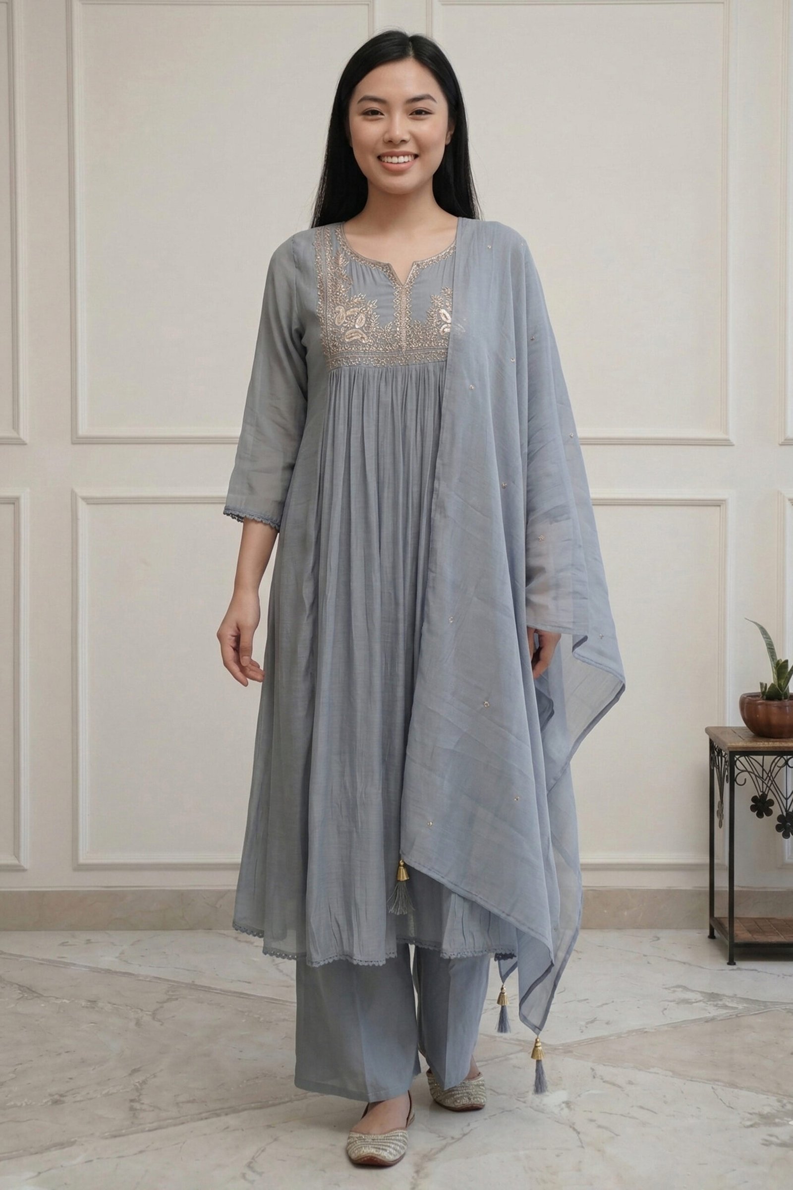 Capture the essence of artistic grace with the Majuli Muse Kurti Set. Rendered in a stunning teal blue, this ensemble features a beautifully flared silhouette that offers both movement and elegance. The bodice is the centerpiece, adorned with dense, hand-embroidered floral motifs in a U-shaped pattern, which flows seamlessly into soft gathers at the waist for a flattering, draped effect.