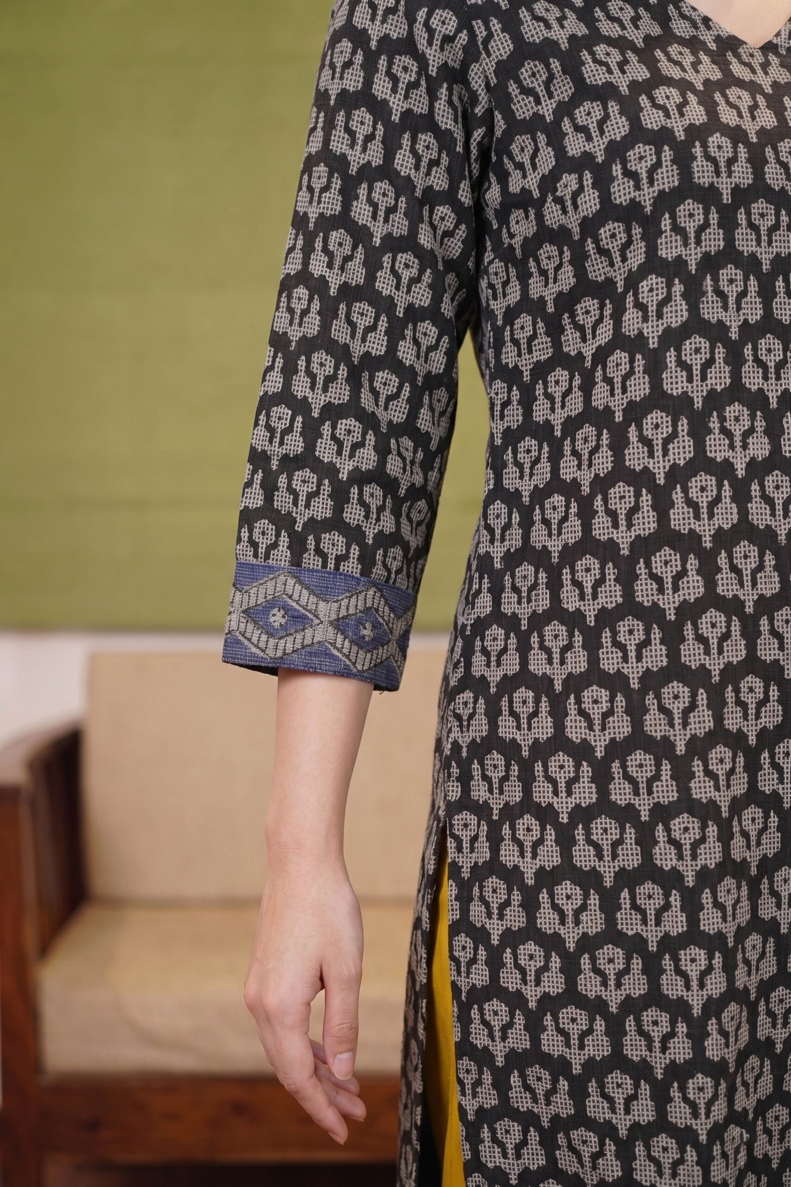 The straight-fit kurta features a deep charcoal-black base adorned with a symmetrical beige floral buta print that creates a sophisticated textured effect. The elegant V-neckline leads into a streamlined silhouette, while the three-quarter sleeves are finished with a unique indigo blue geometric border for a pop of unexpected color. To complete the vibrant look, the set includes solid mustard yellow trousers and a lightweight, mustard-and-black striped dupatta featuring traditional block-printed accents and soft tassel ends.