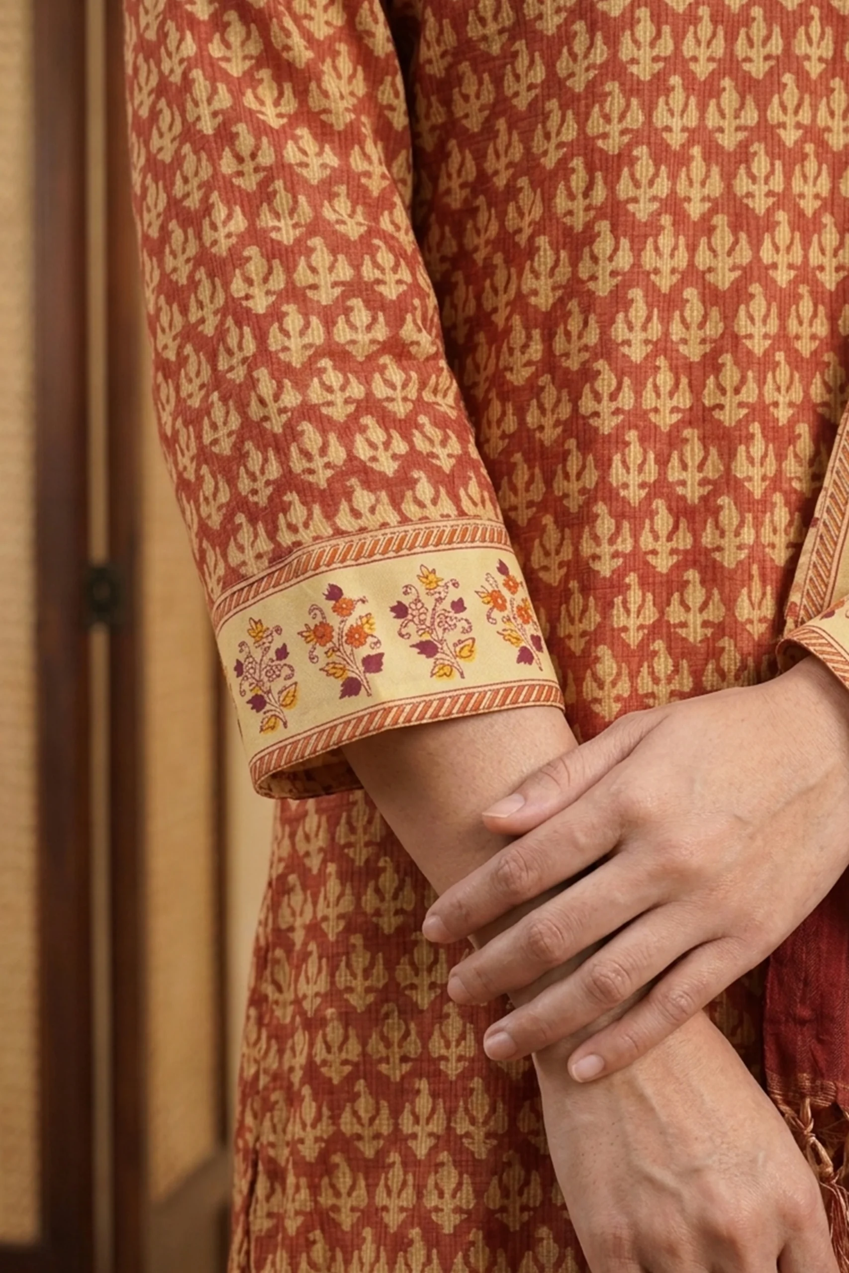 The kurta features a rich rust-toned base, beautifully accented with a delicate cream-colored geometric hand-block print. Its minimalist round neckline is enhanced by a subtle keyhole opening and a single button detail, allowing the intricate fabric texture to shine. The sleeves and hem are defined by wide, cream-toned borders that showcase vibrant floral sprigs in orange and plum hues. Completing the ensemble are straight-fit trousers featuring a bold floral vine motif and a matching airy dupatta with decorative borders. Breathable and sophisticated, the Nysa set is an ideal choice for office wear, cultural gatherings, or refined everyday elegance.