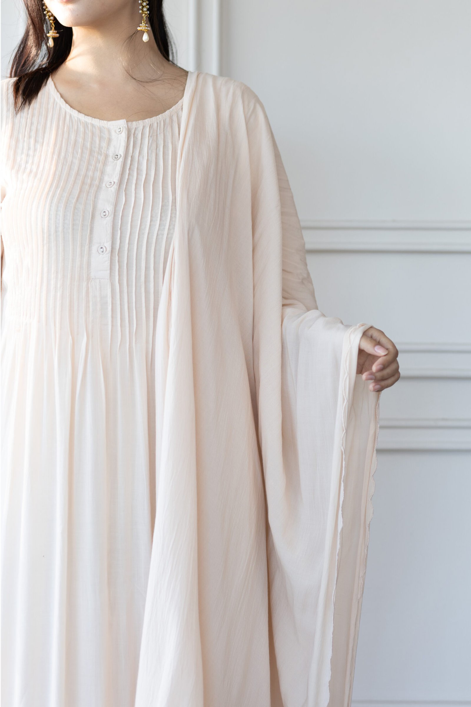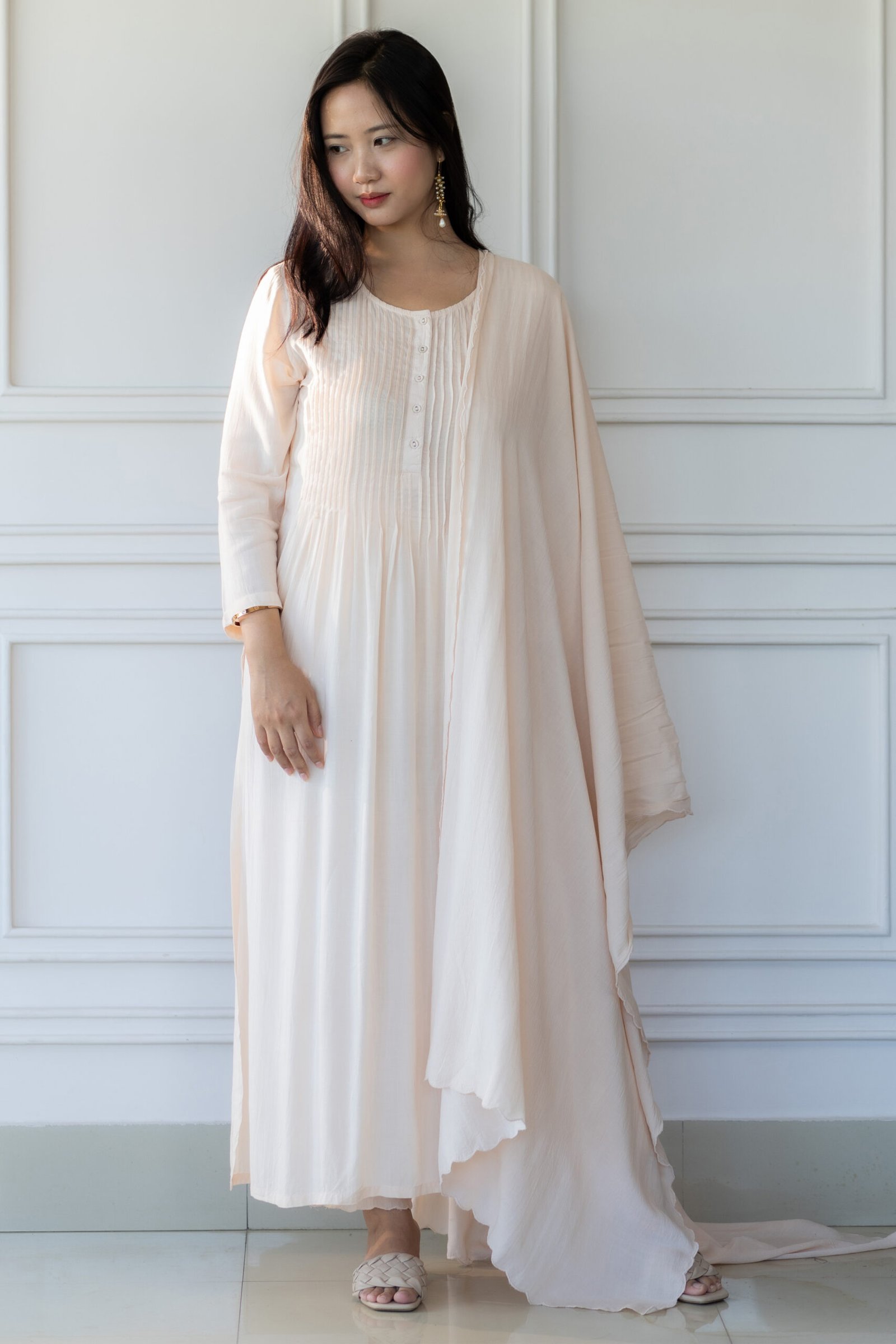 Blush-hued Anarkali kurti with pintuck pleats, button detailing, and a matching dupatta—crafted for graceful elegance.