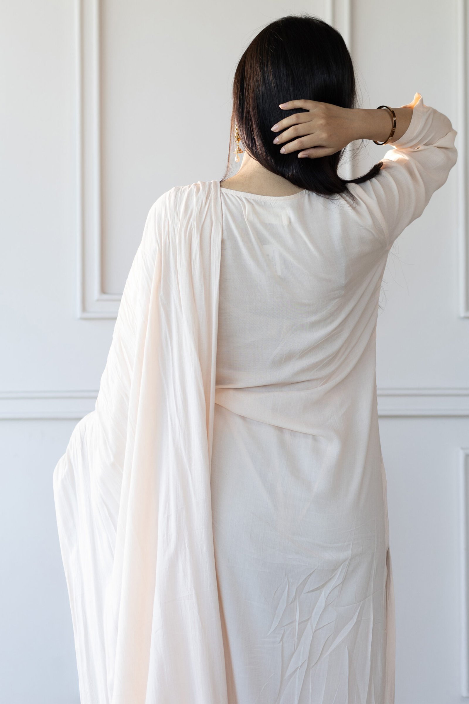 Grace meets purity in the Pavitra Anarkali kurti—a blush-toned ensemble crafted for timeless elegance. Featuring vertical pintuck pleats on the bodice, a round neckline, and delicate button detailing, this kurti flows into a soft, pleated silhouette that flatters every frame. Paired with a matching semi-sheer dupatta, Pavitra evokes sacred simplicity and refined charm. Ideal for festive gatherings, cultural events, or serene everyday wear.
