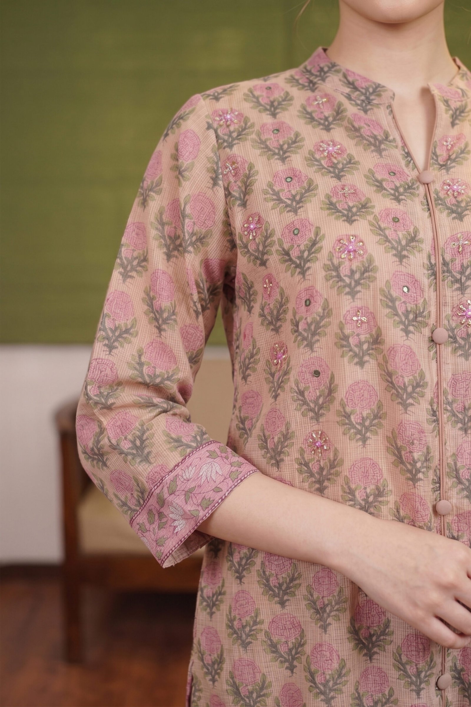 The kurta features a soft blush base adorned with classic hand-block floral butas in dusty rose and sage green. Each motif is meticulously accented with hand-placed sequins and tiny beads, adding a subtle shimmer to the floral landscape. The silhouette is elevated by a sophisticated mandarin collar with a button-down placket featuring tonal fabric-wrapped buttons. Complemented by beige straight-fit trousers and a breezy, semi-sheer dupatta with a traditional geometric border, this set is a must-have for the discerning ethnic wardrobe.
