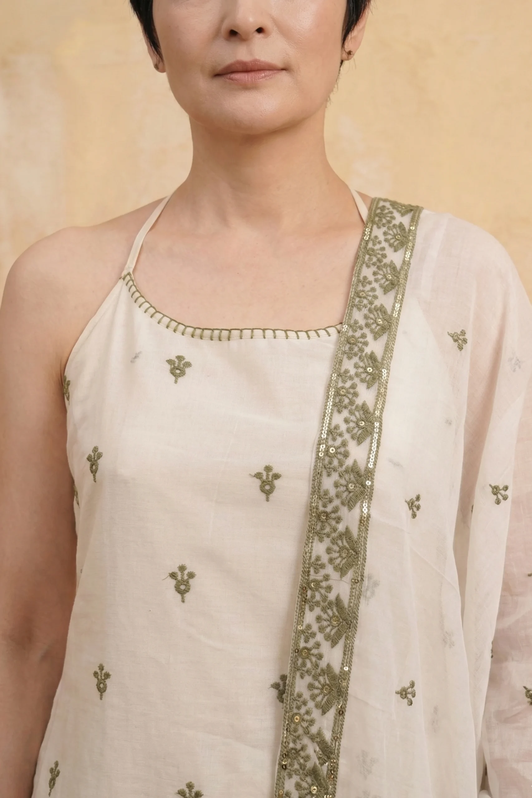 The kurta features a contemporary halter-neck design with slender, adjustable straps, providing a fresh, high-fashion take on traditional ethnic wear. The natural beige canvas is adorned with all-over floral embroidery in a deep olive green thread, leading down to a magnificent, oversized scalloped hemline. This dramatic border is meticulously detailed with dense threadwork and tiny, light-catching mirrors that add a touch of festive sparkle. The set is paired with matching wide-leg palazzos featuring coordinating olive embroidered borders and an ethereal sheer dupatta finished with a heavy floral lace trim. Perfect for garden weddings, afternoon soirées, or any occasion where you want to radiate effortless, grounded elegance.